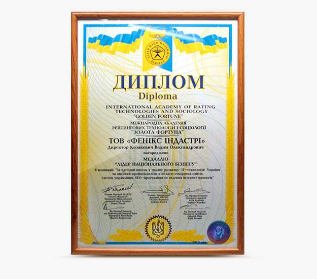 Наша Веб студия «Феникс Индастри» была награждена дипломом и медалью «Лідер національного бізнесу» в номинации: «За весомый вклад в развитие IT-технологий, Украины и высокий профессионализм в области создания сайтов, систем управления, SEO-продвижения и ведения интернет проектов ».