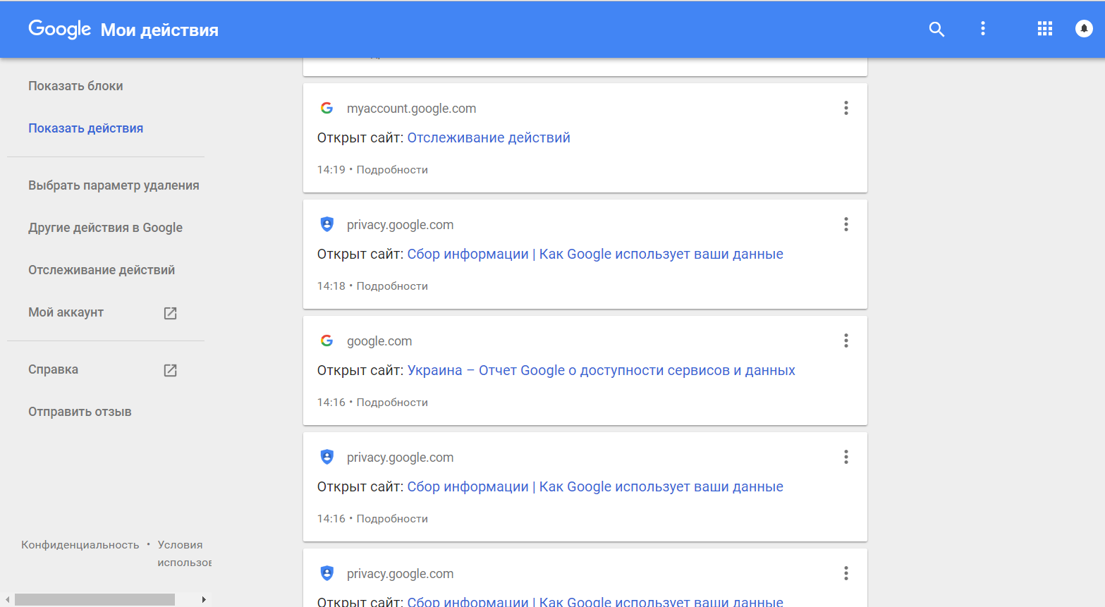 Хотите узнать, какие сайты вы просматривали, какими приложениями пользовались на смартфоне и кому звонили? Для этого существует официальный сервис «Мои действия» в настройках аккаунта. Перейдите по ссылке и введите логин, пароль от учетной записи Google, используемой в Chrome, на Android смартфоне или другом синхронизированном устройстве. Взгляду предстанет такая картина.