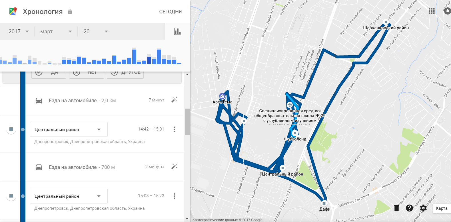 Пролистайте. Данные действительно исчерпывающие. От зоркого взгляда робота не уходит ни одно действие. Но это еще не все. Google знает, где в конкретный момент времени находится каждый пользователь Android смартфона с активированными функциями геолокации и передачей данных в фоновом режиме (при её отключении, перестают работать некоторые сервисы, поэтому опция, как правило, активна). История передвижений по дням и за весь период доступна по следующей ссылке. Стоит ли уточнять, что данные очень точные. Смотрите сами.