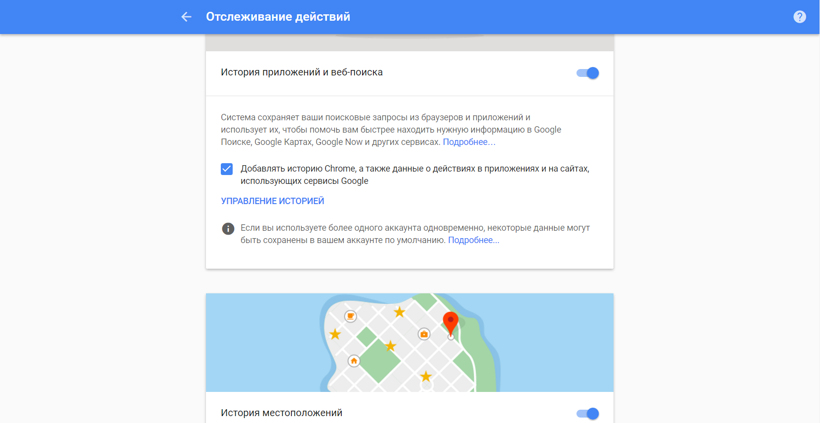 Благо, параметры отслеживания тонко настраиваются. Чтобы скорректировать их, перейдите в меню «Отслеживание действий». Здесь вы сможете отключить сбор статистики просмотров веб-страниц, YouTube, перемещений, голосового управления и информации устройств.