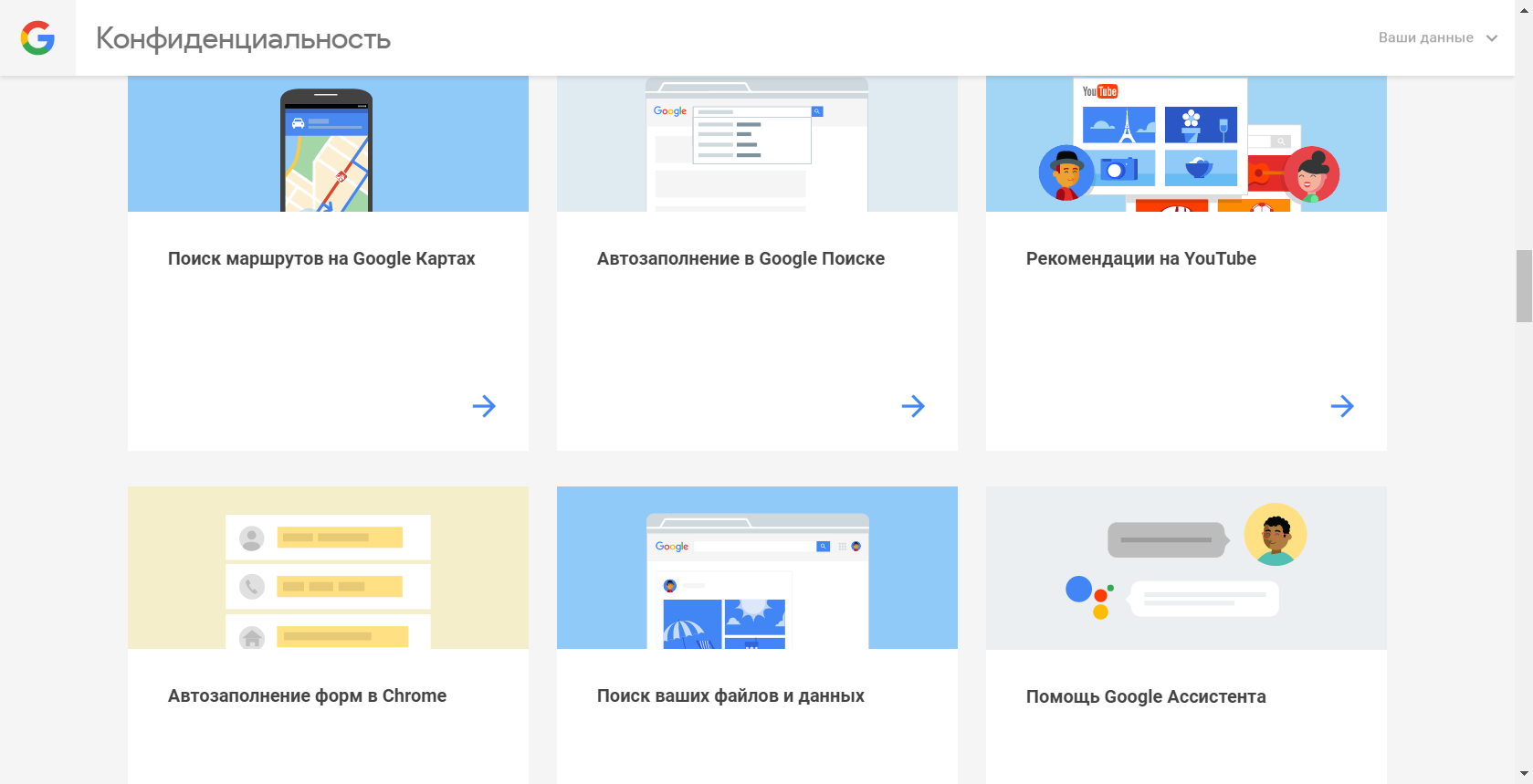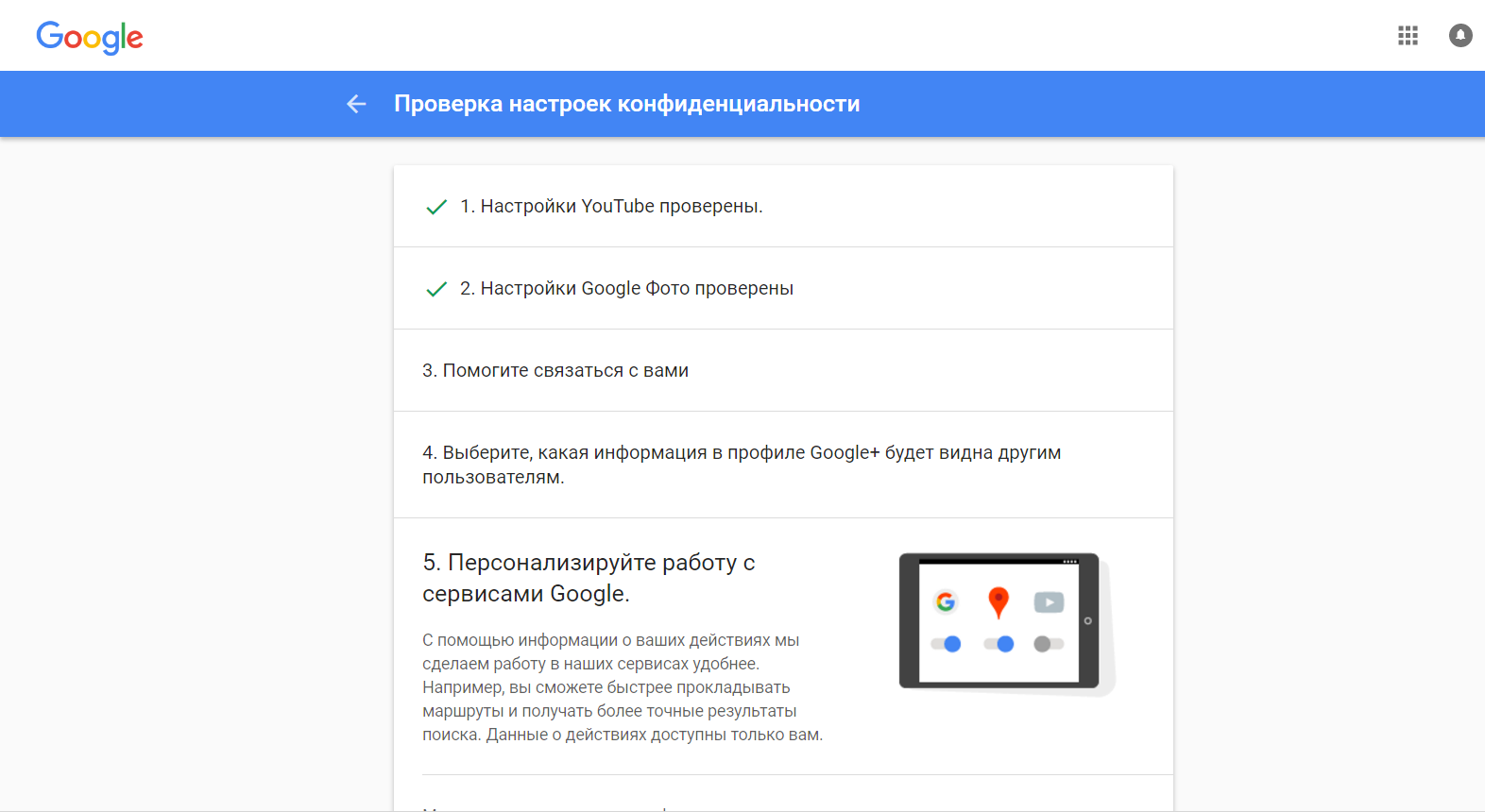 Немногие знают, что в недрах учетной записи скрыт мастер настройки параметров конфиденциальности для всех основных сервисов «Гугл». Рекомендуем каждому пользователю перейти к нему для проверки настроек. Опять же, не бойтесь снимать галочки. Во-первых, вы всегда сможете поставить их обратно, а во-вторых, просто прочитайте информацию в окне подтверждения действия. Оставьте функцию включенной, если она необходима для использования чего-либо необходимого.