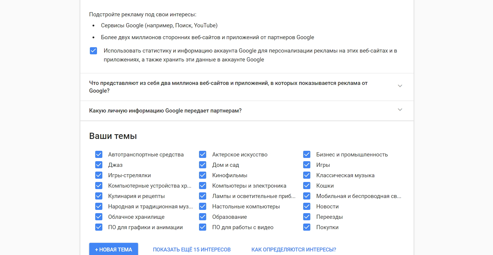 Последний пункт мастера проверки настроек конфиденциальности вызывает особый интерес – он позволяет настроить предпочтения по рекламе. Да, все верно, здесь вы сможете выбрать, объявление какой тематики будут отображаться во время серфинга. Не удивляйтесь, если, к примеру, увидите галочку на пункте «джаз», который вы никогда не слушали, алгоритм не очень точный.