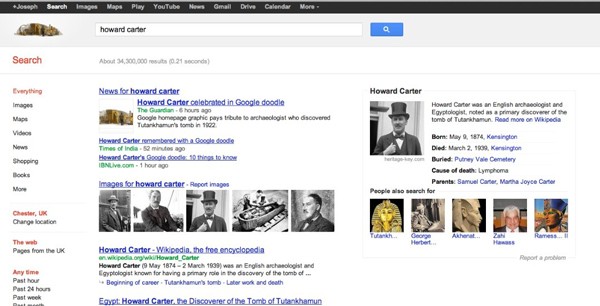 При вводе в Google запроса [Howard Carter], пользователи увидели не только традиционную выдачу, но и биографию Горварда Картера справа и ссылки на подобные запросы, которые вводили другие пользователи по данной тематике.
