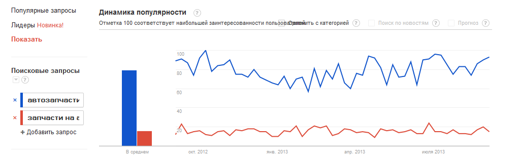 Из графика видно, что запрос «автозапчасти» гораздо популярнее запроса «запчасти на авто».