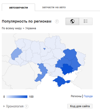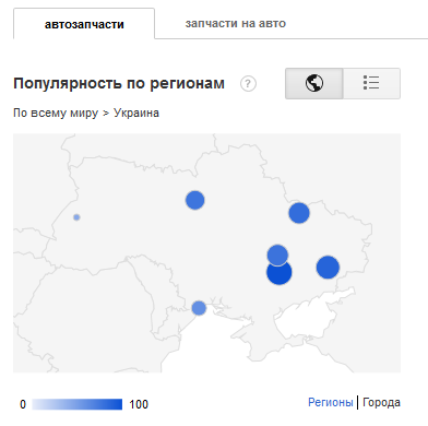 Из рисунка видно, что наибольшей популярностью запрос «автозапчасти» пользуется в Киеве, АР Крым и Запорожской области. Также довольно высокий спрос в Днепропетровской, Харьковской, Донецкой, Одесской и Львовской областях.