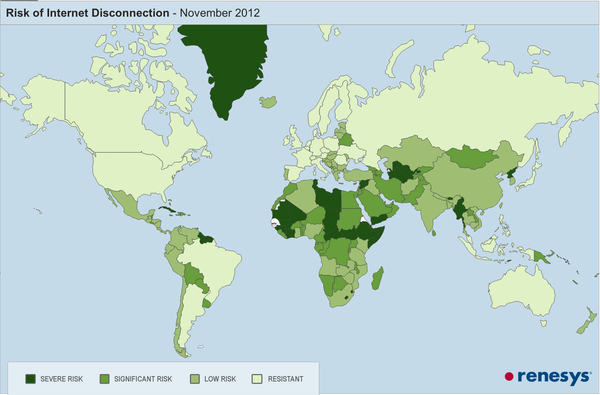 Наиболее подвержены риску остаться без интернета страны, в которых доступ в мировую сеть предоставляют одна или две крупные компании. К таким странам относятся Сирия, Узбекистан и Пакистан.