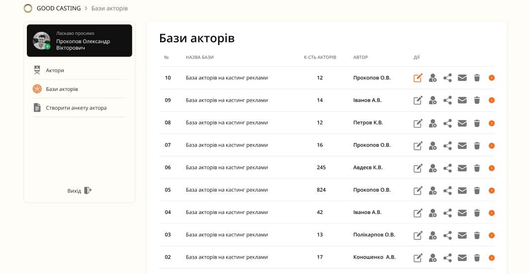 Створені бази акторів можна переглядати у відповідному розділі кабінету та виконувати з ними різні дії, такі як відправлення прямого посилання на базу, розсилка добірки на кілька електронних адрес, редагування акторського складу тощо.