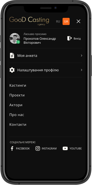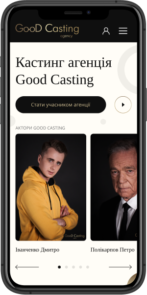 Створення проекту для компанії GoodCasting, яка займається підбором акторів для рекламних, кіно та інших медіа-проектів. Основною метою проекту є презентація агентства та його послуг для зацікавлених користувачів, створення функціоналу для подання анкети на приєднання до агентства, а також розробка особистого кабінету для власників GoodCasting з можливістю взаємодії із загальною базою акторів та формування баз під відповідні проекти.