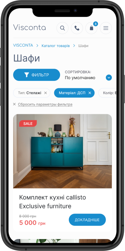 Розробка інтернет-магазину для української компанії Visconta, що займається виробництвом меблів. Реалізація проекту передбачала створення платформи із простим, інтуїтивно зрозумілим алгоритмом пошуку та купівлі товарів, з детальною інформацією щодо термінів та варіантів оплати замовлень.